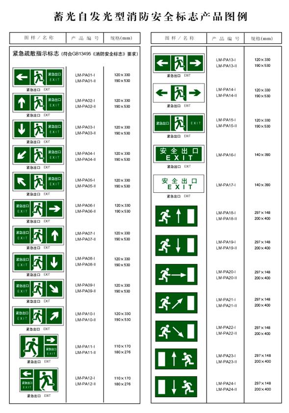 產(chǎn)品系列 蓄光自發(fā)光型消防安全標志包括:疏散通道、疏散樓梯、緊急出口、障礙物、消防器材標志以及警示、禁止、指令性標志。
